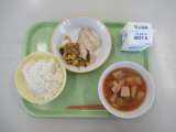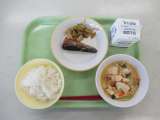 ごはん ぎゅうにゅう あかうおのしおやき チンゲンサイソテー とりにくとじゃがい...