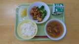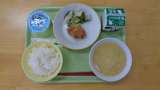 今日の献立は、ご飯、牛乳、鰆の西京焼き、華風和え、ミニトマト、じゃがいもと鶏そ...
