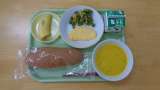 今日の献立は、黒糖コッペパン、牛乳、オムレツ、アスパラサラダ、かぼちゃポタージ...