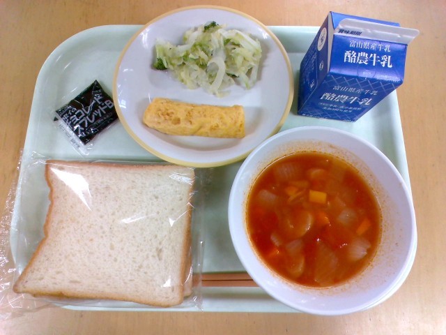 食パン、牛乳、たまごロール、フレンチサラダ、ミネストローネ、チョコレートクリーム
