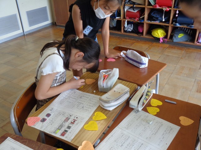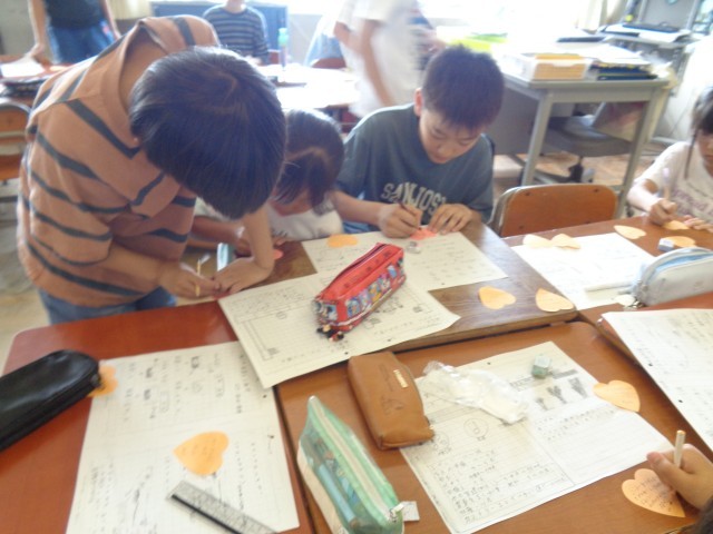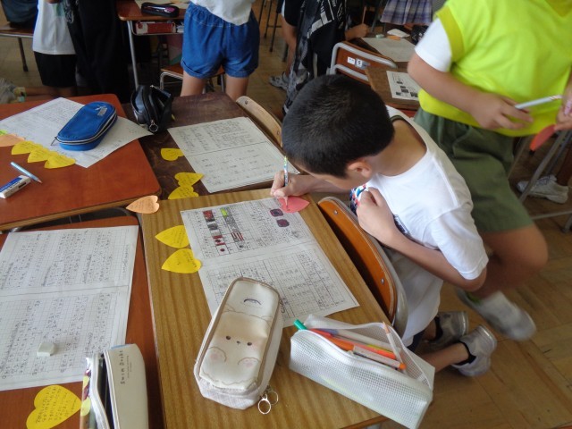 自主学習の内容、まとめ方、字の丁寧さなど、たくさんの工夫を見つけて伝え合っていました。