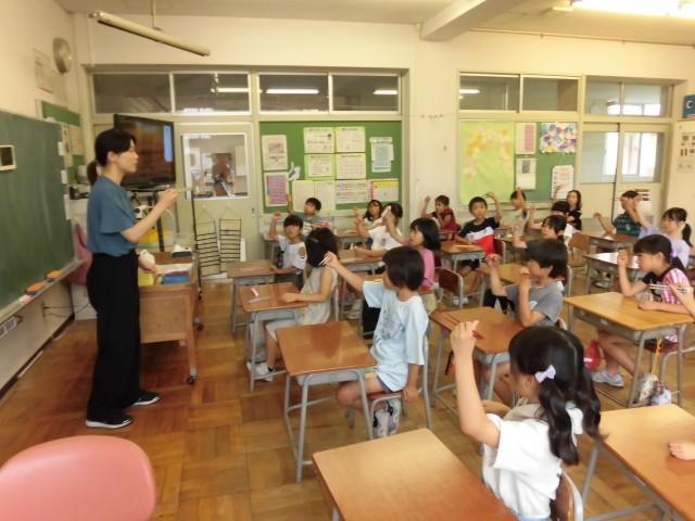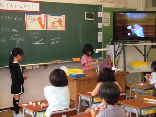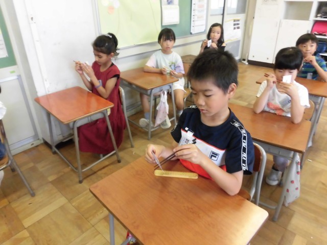 栄養教諭にお箸の使い方の学習を教えてもらいました。人差し指と中指でお箸を挟みながら動かす練習をしたり、スポンジを並べたり積み重ねたりしました。