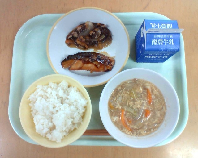 ごはん、牛乳、ふくらぎの照り焼き、もずくのチャプチェ、中華かきたま汁