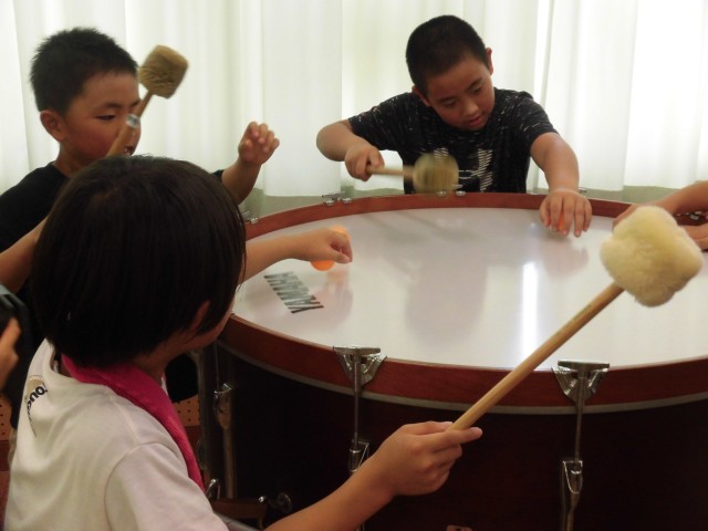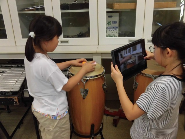 理科「音のせいしつ」では、音が出るときの物の様子を調べています。子供たちは、楽器に付箋を貼ったり、ピンポン玉を乗せて音を出したりして調べていました。友達と協力して実験の様子を動画で記録して考えていました。