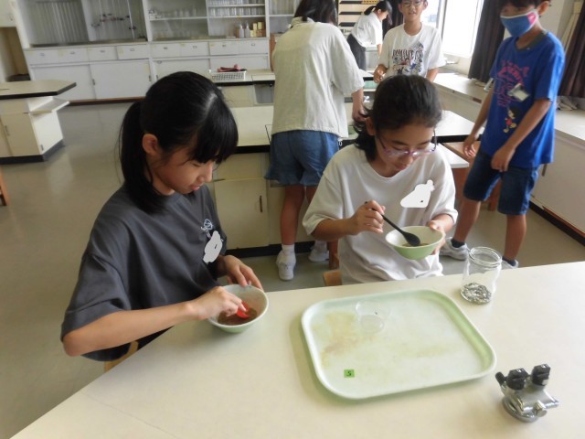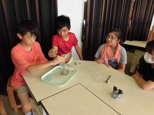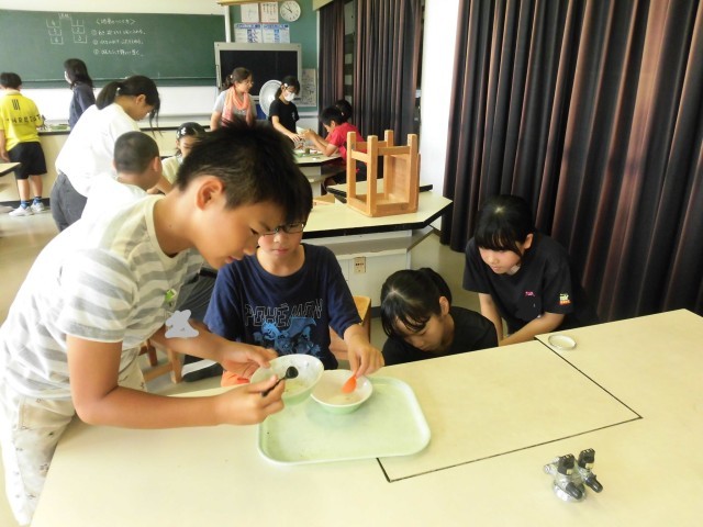 6年生の理科では、大地のつくりの学習をしています。がけの様子がしま模様になっているのは、どろやれき等、種類の違うものが堆積したからだということが分かった6年生。今日は、ガラス瓶を使って自分たちで地層をつくってみました。1週間後、どのような地層ができているか楽しみです。