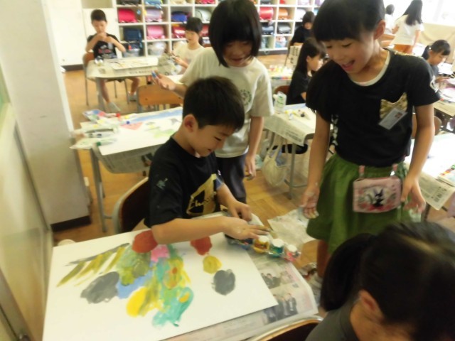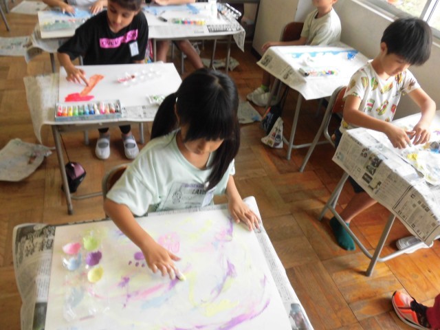 図画工作の学習で、液体粘土と絵の具を混ぜて、思いついたものを描きました。指全体に付けて伸ばす子や何色も重ねる子など、活動の中でたくさんの工夫が見られました。初めての液体粘土でしたが、「とろとろで気持ちいい」と感触を楽しみながら作品を作ることができました。