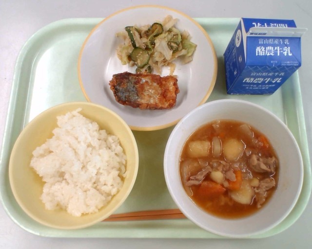 ごはん、牛乳、さばの竜田揚げ、ごま和え、豚肉の炒め煮