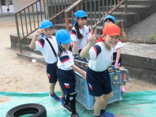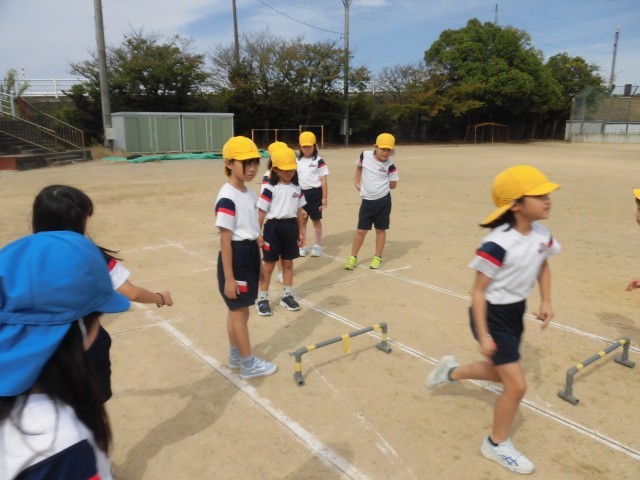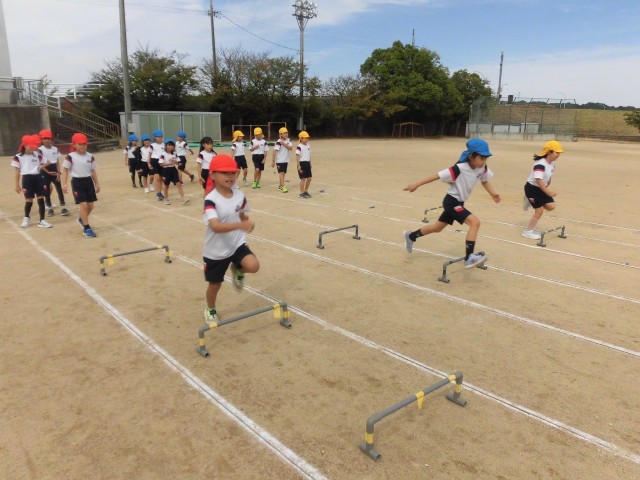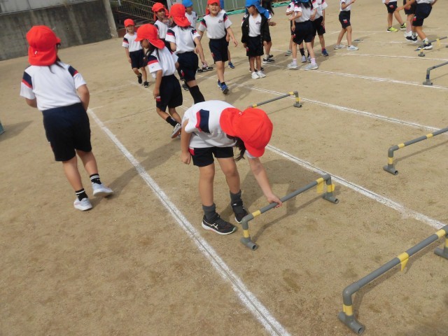 体育科の学習で、かけっこをしました。リレー遊びをしたり、コースに障害物を置いて飛び越えながら走ったりしました。コースに慣れてくると、自分たちで障害物を置く位置をグループで話し合って決めて挑戦してみました。コーンや障害物の片付けまで、しっかりとやる2年生とても頼もしいですね。