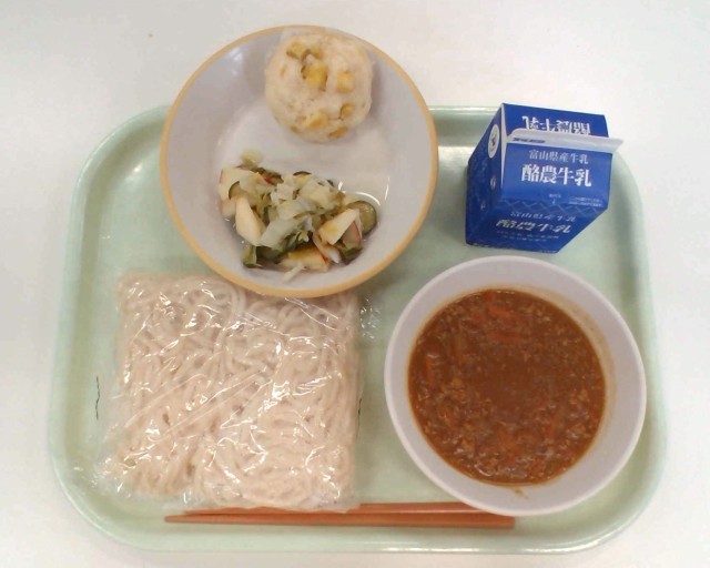 一年生にとっては初めてのソフト麺でした。袋の中で4等分し、少しずつカレーソースとからめて食べていきます。来月のソフト麺は、富山の食材をたっぷり使ったソースが登場します。楽しみですね。