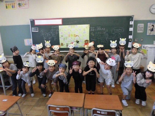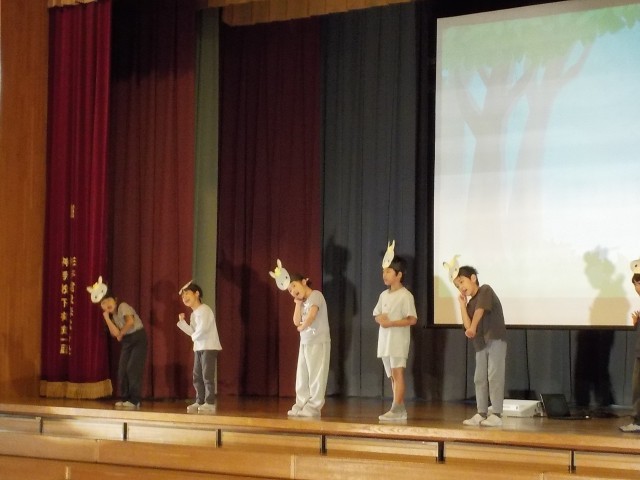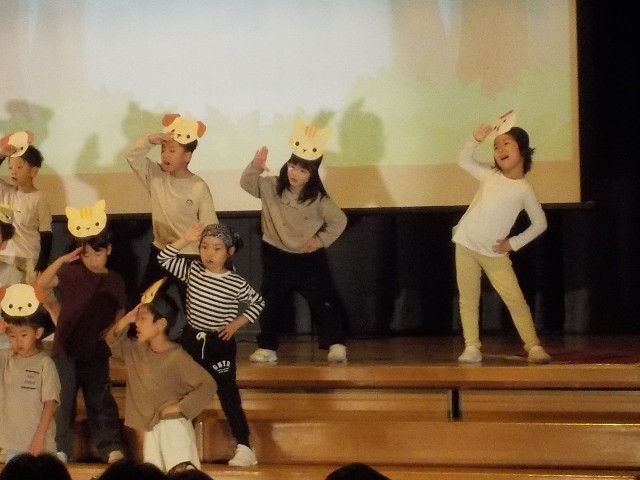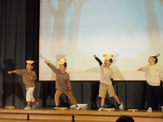 学習発表会では、劇「ブレーメンのおんがくたい」を披露しました。初めてたくさんの人の前で発表する機会でしたが、大きな声で動作も付けて頑張ることができました。戻ってきた子供たちの表情はとても明るく、達成感を感じていました。