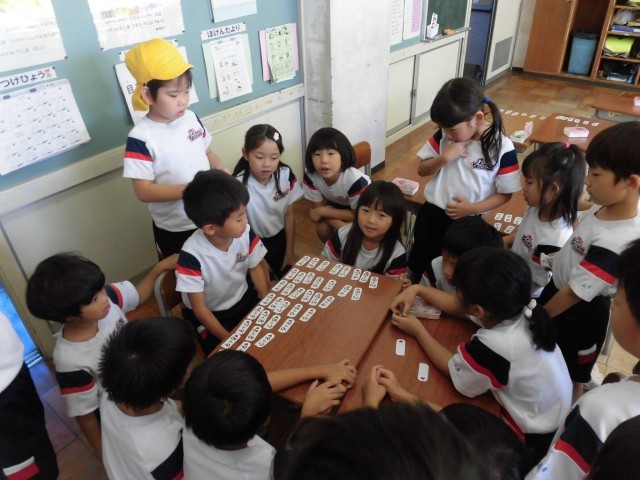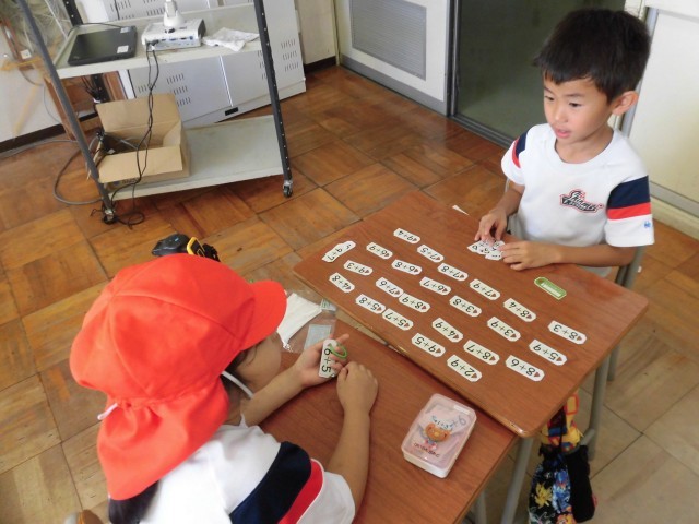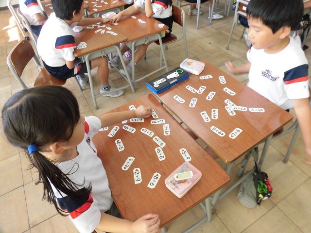 1年生は、算数科では繰り上がりのあるたしざんの勉強をしています。今日は、計算カードを使って、友達と問題を出し合ったり、同じ答えになるものを仲間分けしました。難しいことも友達と競い合ったり、協力したりしながら楽しんで学習に取り組んでいます。