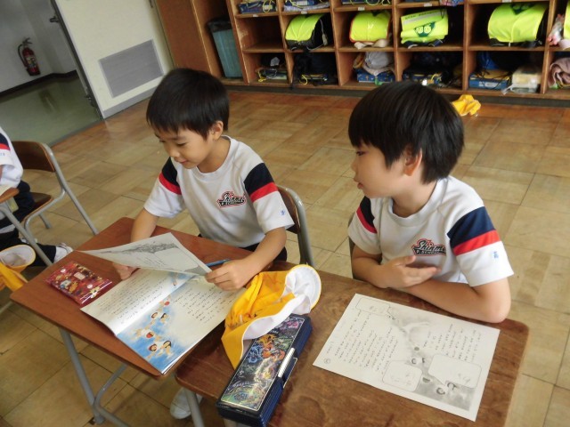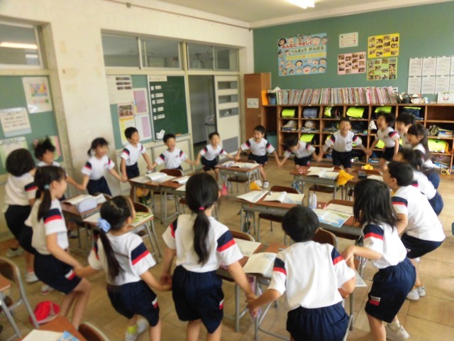 国語では、くじらぐもの音読に取り組んでいます。今日は、くじらぐもにとびのるときのかけ声を、全員で手を繋いで音読してみました。「みんなでやると天まで届きそうだった!」と場面を思い浮かべながら楽しく音読することができました。