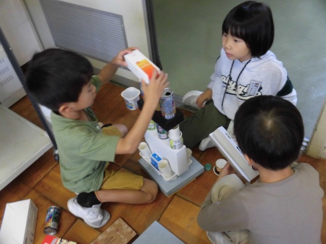 算数科「かたちあそび」では、様々な形の箱を使い大きなタワーを作りました。「四角の箱だと上手く積めるけど、丸い箱の上には積めないな」「1番下は高さが同じ缶を使うと高く積めそう」と形の特徴に気付き、工夫して積み上げていました。