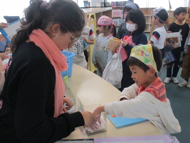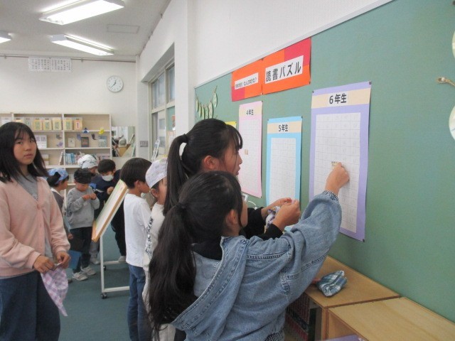 今日から神明小学校の「読書週間」が始まりました。図書委員会では「読書パズル」と「しおり作り」を企画しました。「読書パズル」は図書室で本を借りるとパズルのピースくじを引くことができるので、たくさんの人が本を借りていました。