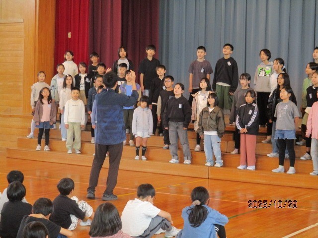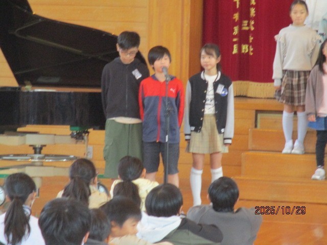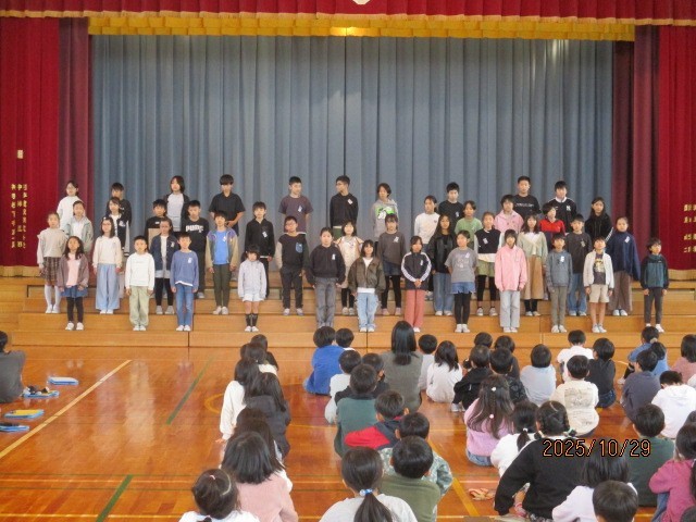 11月4日に行われる区域連合音楽会向けて、全校生徒の前で音楽会で歌う「青空に深呼吸」を披露しました。これまで練習してきた成果を発揮して素敵な歌声を体育館に響かせました。音楽会本番も素敵な歌声を響かせる姿が楽しみです。