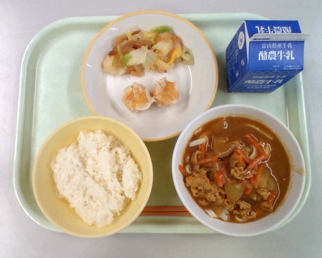 ごはん、牛乳、にんじんシューマイ、福神和え、カレーうどん