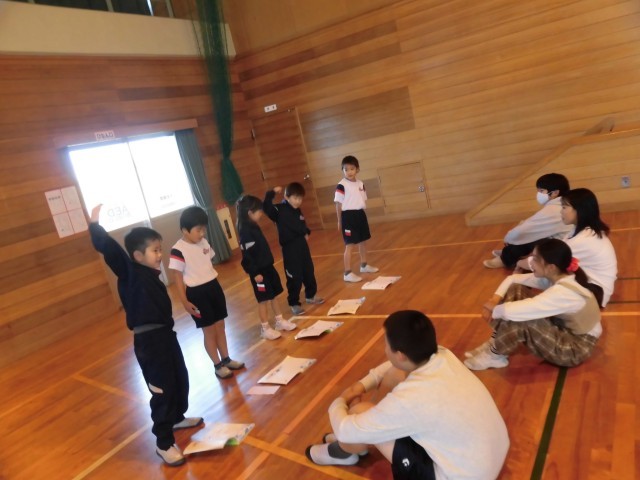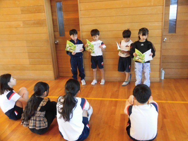 国語科の学習で練習してきた「くじらぐも」の音読を6年生に発表しました。「6年生に楽しんで聞いてもらいたい」というめあてをもち、声の大きさや強弱を意識したり、動きをつけたりと工夫して音読していました。6年生から素敵な感想をもらって、嬉しそうな子供たちでした。