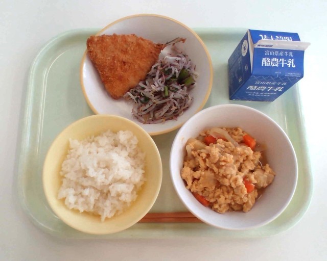 ごはん、牛乳、アジフライ、ゆかり和え、卵とじ