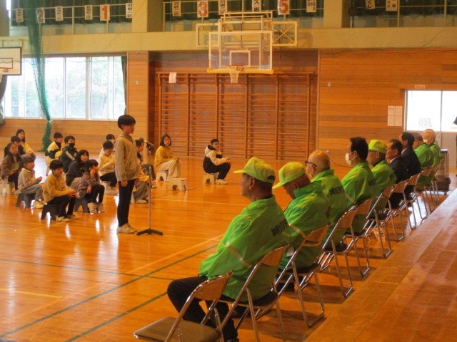 神明地区見守り隊・交通指導員の方々への感謝の集いを行いました。代表児童があいさつをし、6年生がお礼のメッセージをプレゼントしました。全校で「ふるさとの空」を歌い、日頃の感謝を伝えました。神明っ子の登下校を見守ってくださり、本当にありがとうございます。これからもよろしくお願いします。