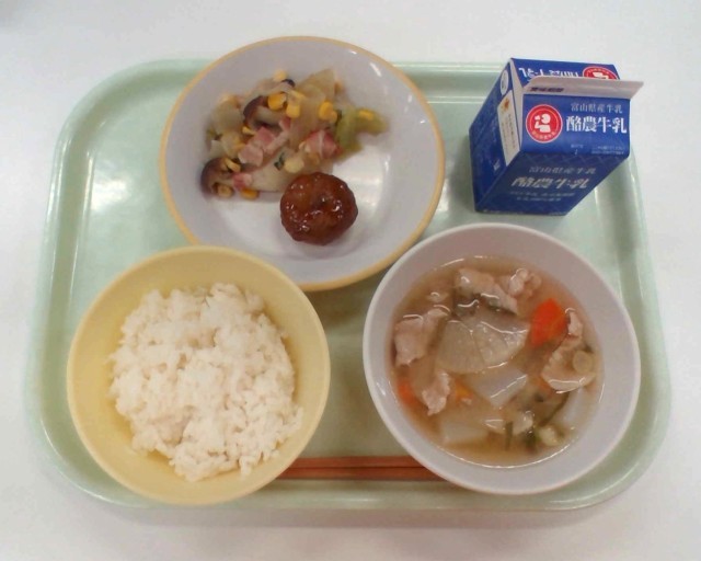 お肉も野菜もたっぷり食べることができる豚汁は、栄養満点のメニューです。全校でおいしくいただきました。
