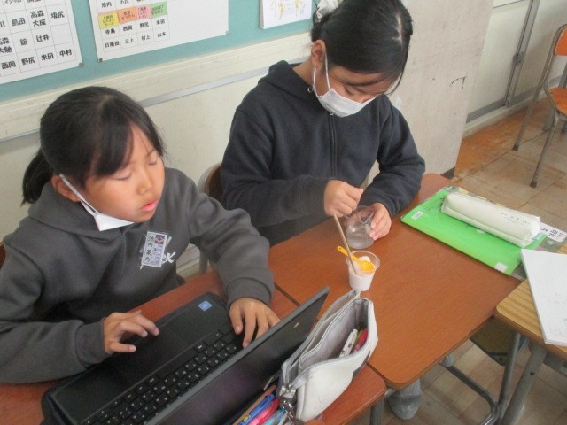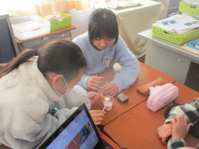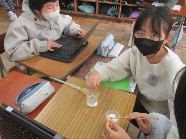 理科の学習では、物のとけ方について学習しています。水に塩やミョウバンはどのくらい溶けるのか実験を通して考えていました。