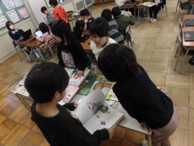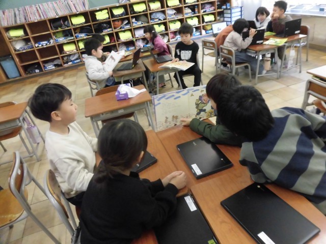国語科の学習では、お気に入りの昔話のおもしろかったところやすきなところをグループで伝え合い、昔話を読んでみました。友達のすきなところを見付けたり、「もっとおもしろいところがあったよ!」と伝え合ったりと楽しみながら昔話の世界を味わっていました。