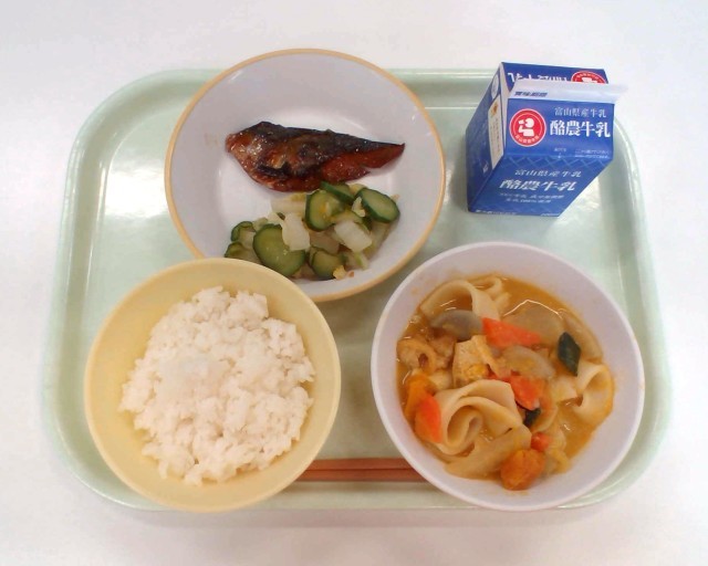 ごはん、牛乳、ふくらぎの照り焼き、ゆず和え、ほうとう鍋