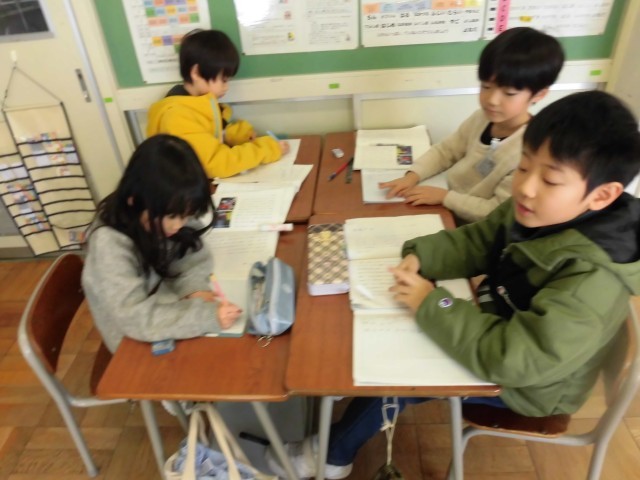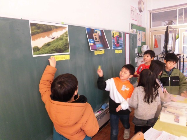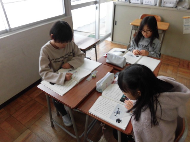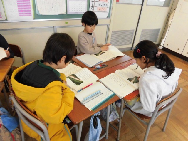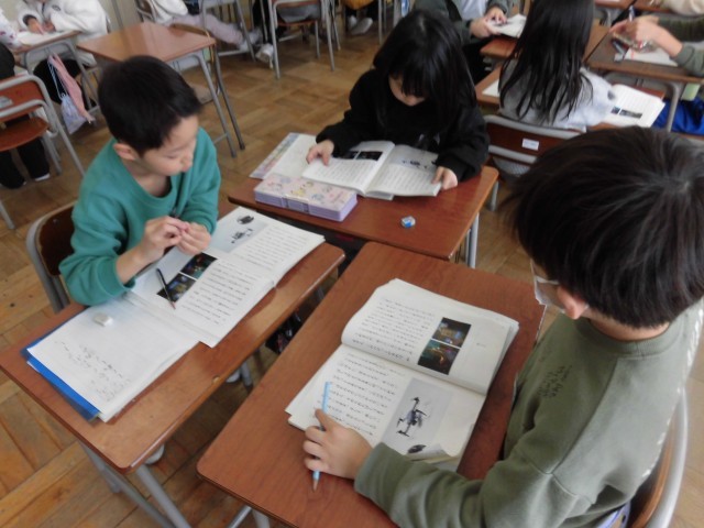 国語科では、ロボットについて学習しています。教科書に載っている3つのロボットの中から一番よいと思うロボットを選び、グループごとにロボットが仕事をするよさについて考えました。「荷物を運ぶ人が足りないときでも、スムーズに荷物を届けられる」や「人間が災害の場所を見に行くと命の危険があるけれど、ロボットだと安全に空から写真や動画を撮影できる」など、グループで考えを深めることができました。