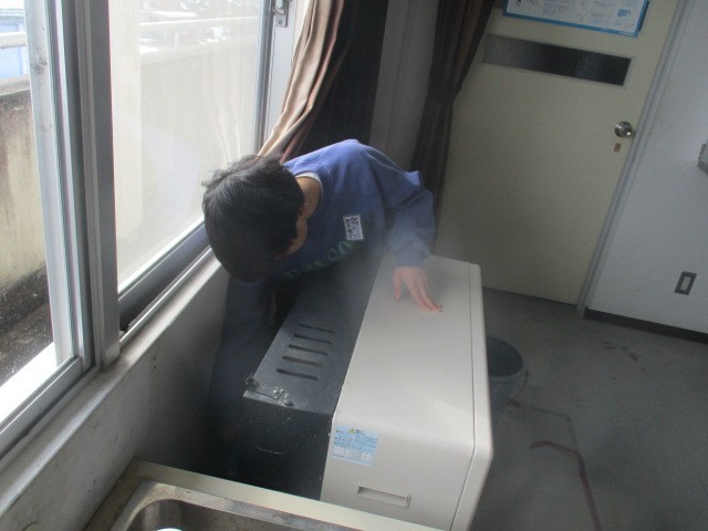 窓ガラスやガスコンロ、ストーブの隙間などを清掃道具も工夫しながら掃除に取り組んでいました。