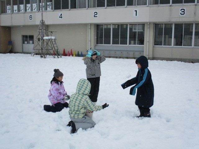 グラウンドで雪遊びをしました。子供たちは土手でソリ遊びをしたり、小さなかまくらを作ったりして楽しんでいました。