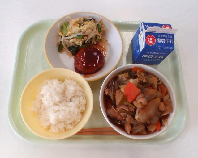 ごはん、牛乳、すり身のお好みソースがけ、ゆば和え、みそ煮込みうどん