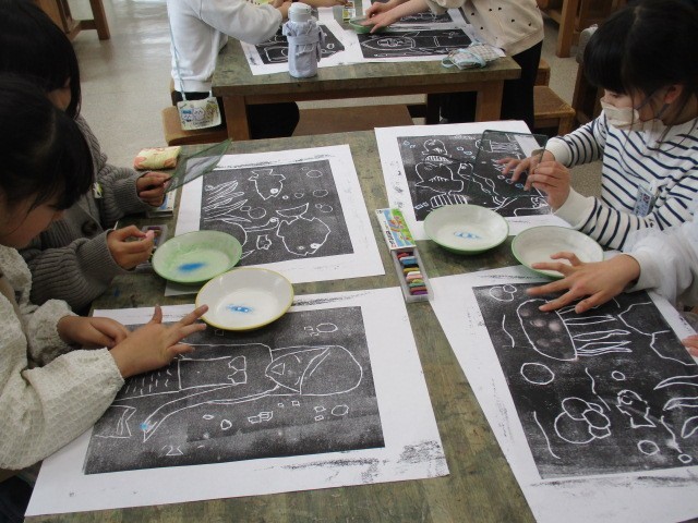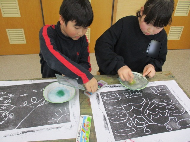 図画工作科の版画では、パステルクレヨンを粉にして色づけをしました。子供たちは色の濃さを調整したり、色を重ね合わせたりして工夫していました。