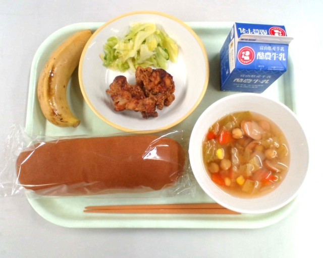 コッペパン、牛乳、鶏肉の塩こうじ揚げ、そえ野菜、ひよこ豆のスープ、バナナ