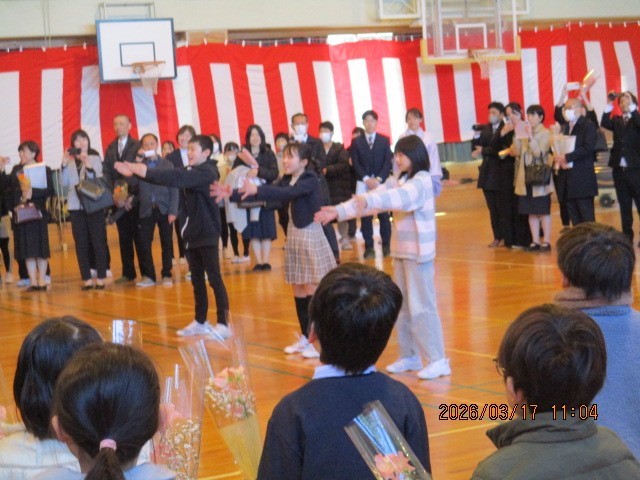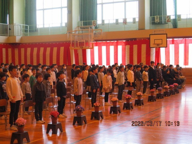 本日は、卒業式でした。卒業生全員揃ってこの日を迎えられたこと、とても嬉しく思います。これまでの練習の成果を発揮し、気持ちを込めて呼びかけや歌を頑張った卒業生の皆さん、これからも自分の道を信じて歩いていってください。在校生のみなさん、態度、言葉、歌に6年生への感謝の気持ち、おめでとうの気持ちがたくさん詰まっていました。とても素敵な卒業式だったと思います。みなさん、ありがとうございました。
