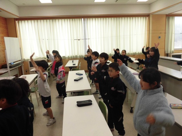 ALTの先生と一緒に英語の歌を歌ったり、体を動かしたりしながら外国語を学びました。動物ビンゴをしながら、様々な動物の英語の言い方を知り、日本語と違うことに驚いている子供や、何度も繰り返し発音している子供の姿が見られ、楽しみながら外国語に触れていました。