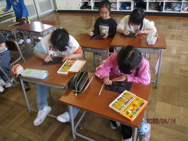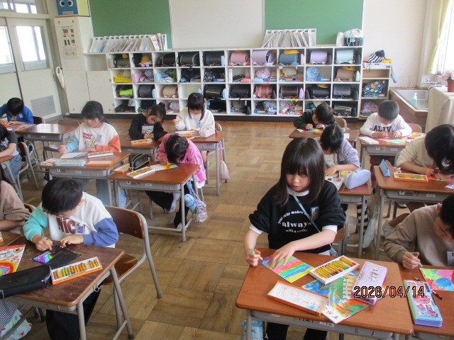 2年生はクレヨンを使って図工をしました。直接模様を描いたり、色を削って模様を描いたり楽しみました。