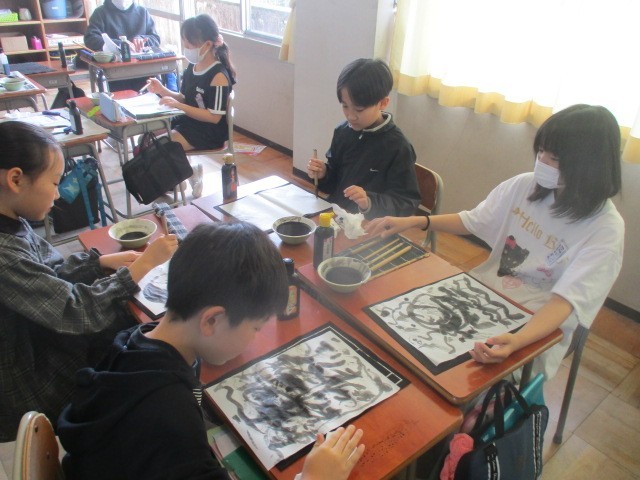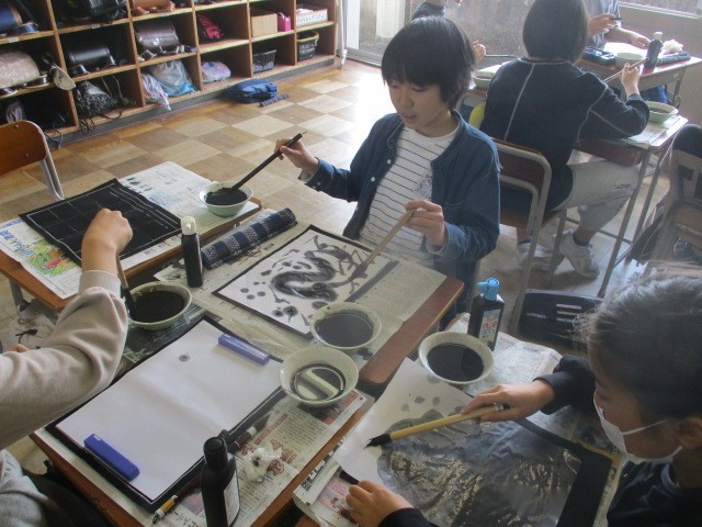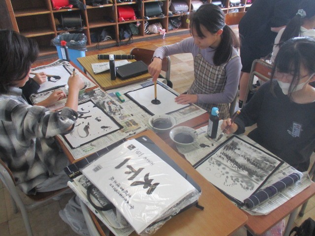 図画工作科の学習では、水墨画に取り組んでいます。