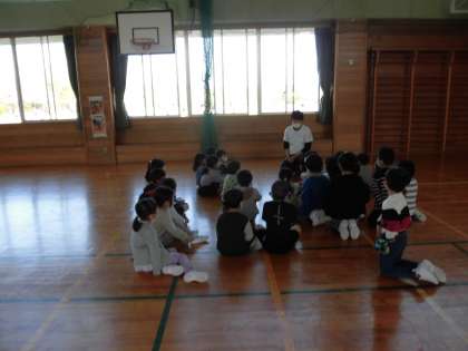 今日から、本格的に小学校での生活が始まりました。今日は、登校後、2年生から6年生のお兄さんお姉さんの走る様子を、体育館から見学しました。