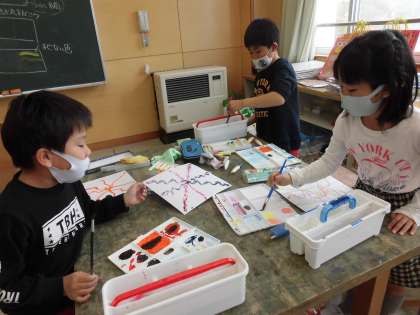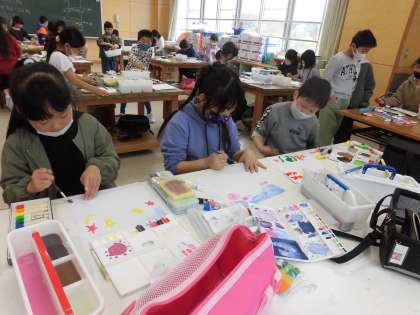 3年生になって初めての図画工作科の学習を、図工室で行いました。まず、絵の具の色を混ぜていろいろな色のまるを描いたり、水の量を調節して一色でも異なる色をつくり出したりしました。その後、学習したことを生かして、白色の正方形の画用紙に好きな色、線、形でデザインしたオリジナルハンカチをつくりました。お気に入りの作品が完成し、「先生、できました」と嬉しそうに見せに来る子供たちでした。