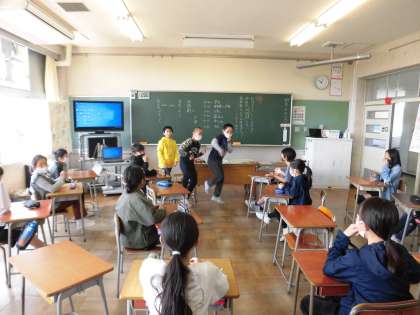 ※写真は外国語活動の様子と、帰りの会でお笑い係の3人が学級のみんなを笑顔にしてくれている様子です。