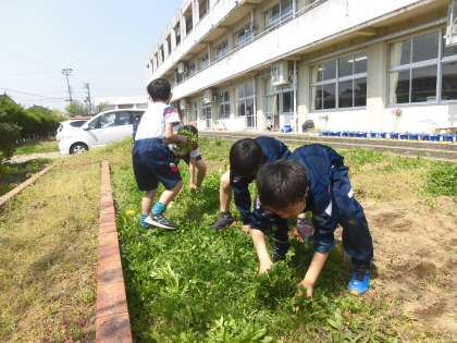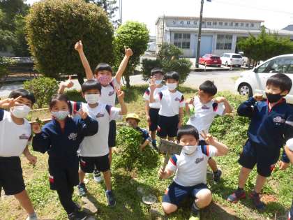 生活科の学習で野菜を育てることになり、まずは畑の草むしりをしました。30分程で、たくさん草を取りきれいになりました!