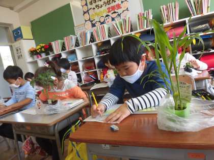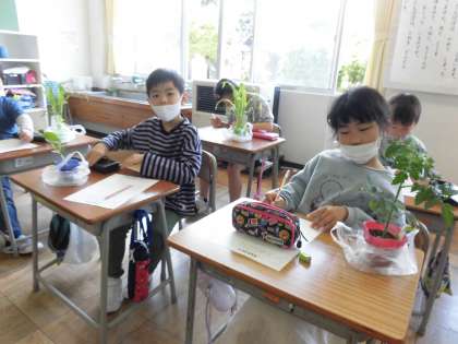 学校に戻ってきてから、苗の観察をしました。どの野菜も元気に成長してほしいですね。