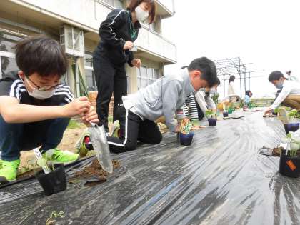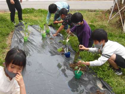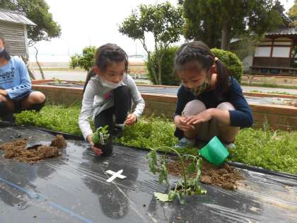 昨日買ってきた野菜の苗を畑に植えました。マルチシートに穴を開けて、土を掘って植えました。伸びてきたら倒れてしまわないように、横に支柱を立てました。明日から、水やり等のお世話をしていきます。