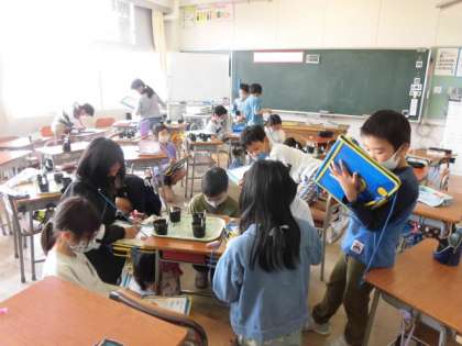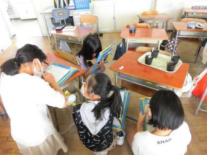 4年生 理科〜ヘチマの芽が出ています!〜 公開日 2021/05/12 更新日 2021/05/12 4年生 みんなで植えたヘチマの芽が出てきました!今日は、ヘチマの芽の観察をしました。触ったり、近付いて見たりしながら、細かい部分まで丁寧に観察していました。これからどのように成長していくのか、楽しみですね♪