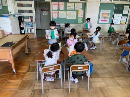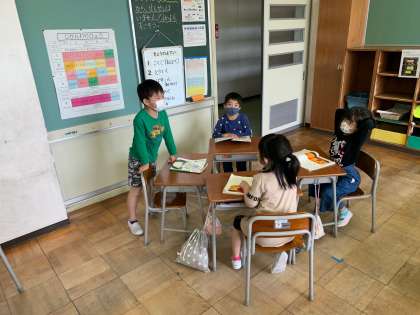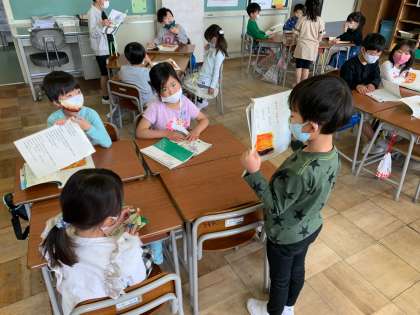 音読の発表会をしました。グループに分かれて、「あさのおひさま」を発表しました。大きな声で、早さや言い方を工夫して読むことができました。