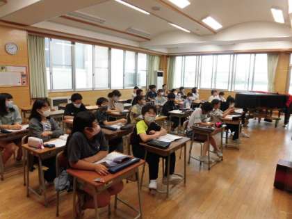 これまでは椅子だけだった音楽室に机も入り、音楽科の学習することになりました。
