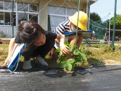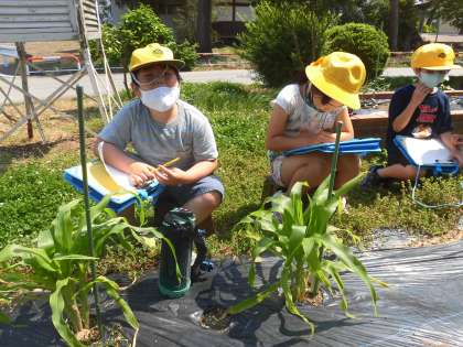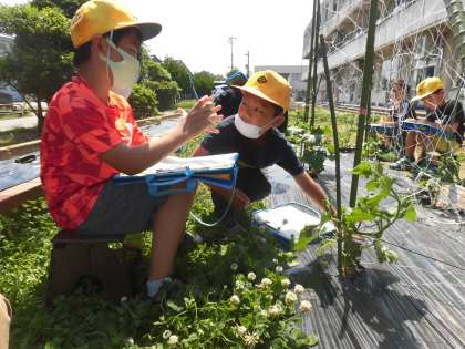 暑い日が多くなり、野菜も元気に成長してきました。子供たちは、畑に出て観察を続けています。花が咲いたり、小さな実がなったりしてきました。