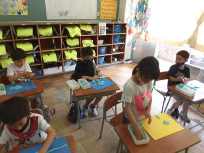 図工の学習では「ぺったんねんど」と題して、粘土を使った作品づくりをしています。「海の中」や「宇宙」等のテーマに沿って、粘土で表現します。