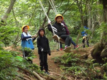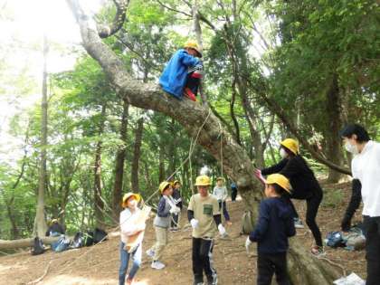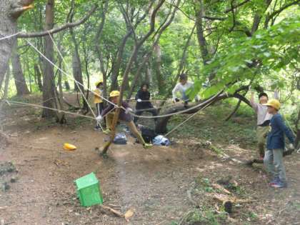 4年生 宿泊学習〜ワイルド遊び〜 公開日 2021/06/13 更新日 2021/06/13 4年生 班ごとに、ロープと板を使って、遊びを作りました。ロープを木にかけるのがとても難しかったですが、工夫して遊びを作り出していました!