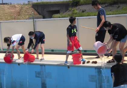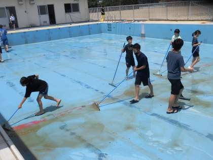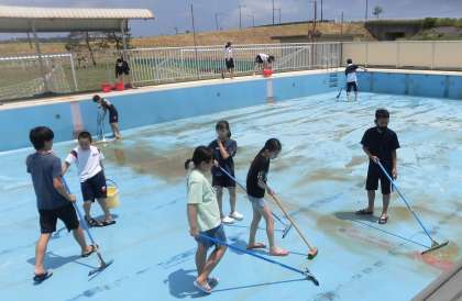 今日、5、6年生が水泳学習にそなえてプールそうじを行いました。昨年、入ることができなかったので、2年分たまった汚れは、相当でしたが、5、6年生のおかげで、とってもきれいになりました。子供たちには、大いにプールを活用し、泳力を身に付けてほしいと願っています。
